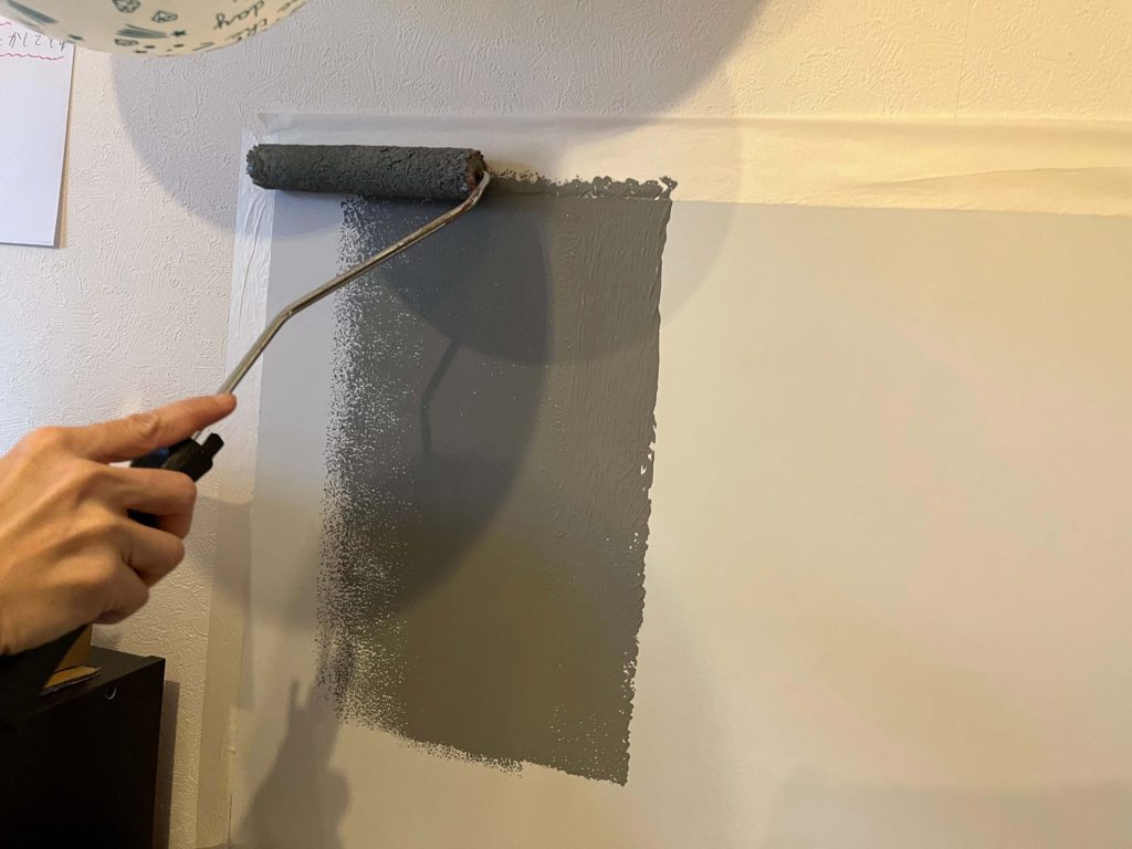 ローラーでムラなく塗っていきます。もちろん刷毛などで塗って風合いを出すのもOK。DIY初心者で均一に仕上げたい場合はローラーがおすすめです。