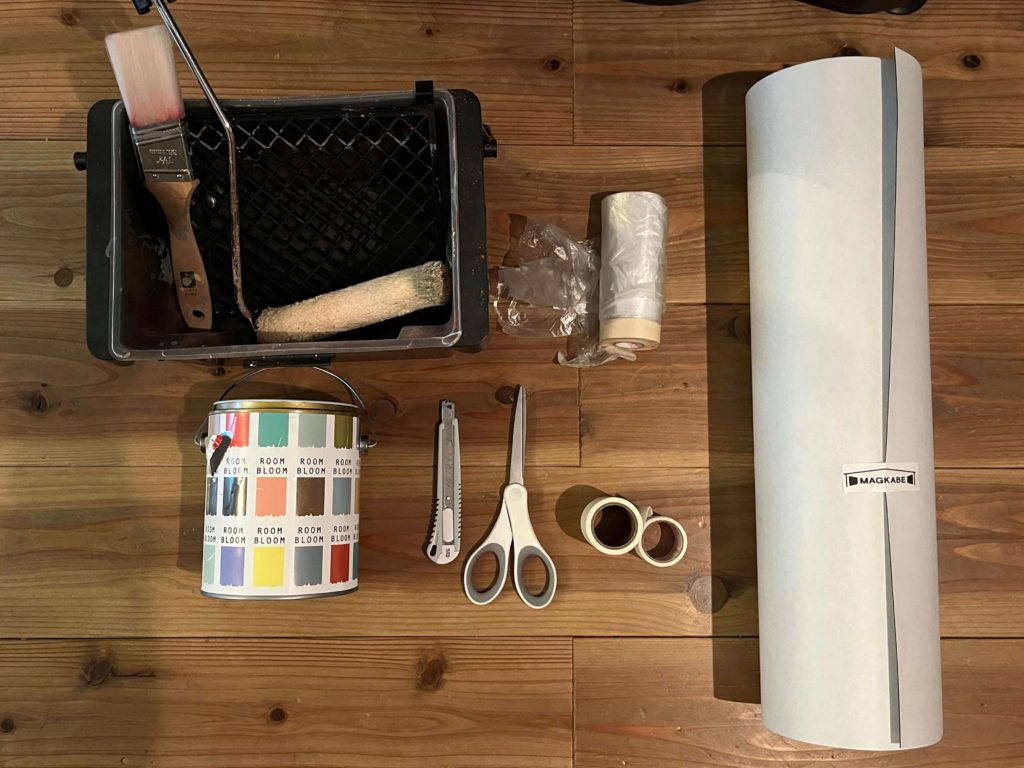 さらに色を塗ることができるものも。今回使う「マグカベ」は白色で、上から水性塗料を塗ることができます。水性の黒板塗料(チョークボードペイントなど)を塗ることもできるため、子ども部屋に貼って黒板に仕上げるのもおすすめです。