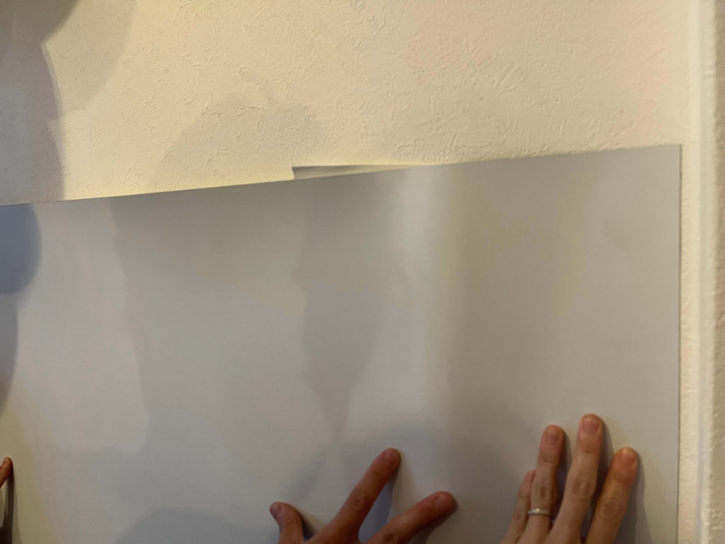 長く・重くなるほどまっすぐ貼るのが難しくなるため、2m以上を貼る場合はふたり以上で作業をするのがおすすめです。ひとりが「マグカベ」を支えて保護シートをゆっくりはがし、もうひとりが密着させながら貼ると良いでしょう。