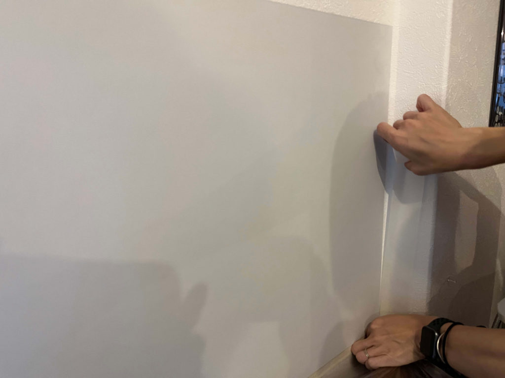 印を付けたら裏側についている保護シートをそっとはがしながら、壁にシール部分を貼り付けていきます。