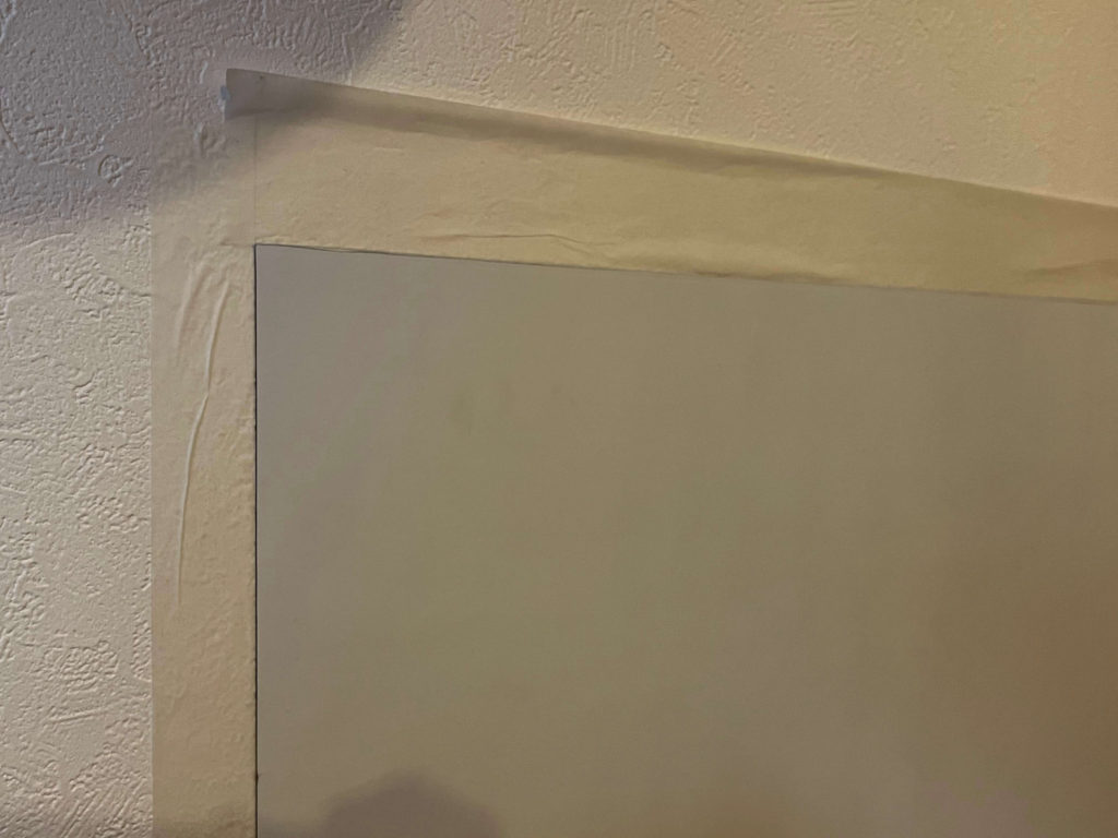塗装の準備をしていきます。マグネットシートの周囲にすき間がないように養生テープ(写真はマスキングテープ)を貼っていきます。この上からペイントするため、壁紙に塗料が付かないようシートの厚みの部分にかかるくらいの感覚で貼ることをおすすめします。