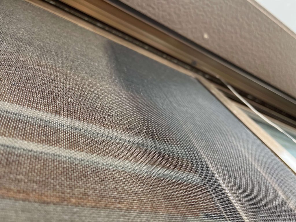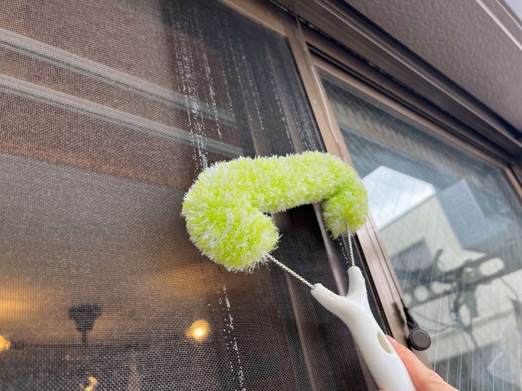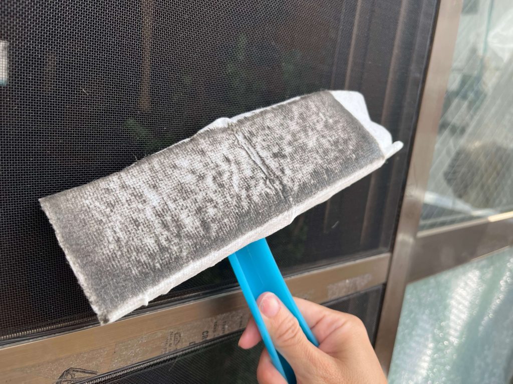 網戸を取り外す必要がなく、水ですすぐことなく、面積が広くてもそれほど時間がかからないものを選び、1年放置された網戸を掃除してみました。